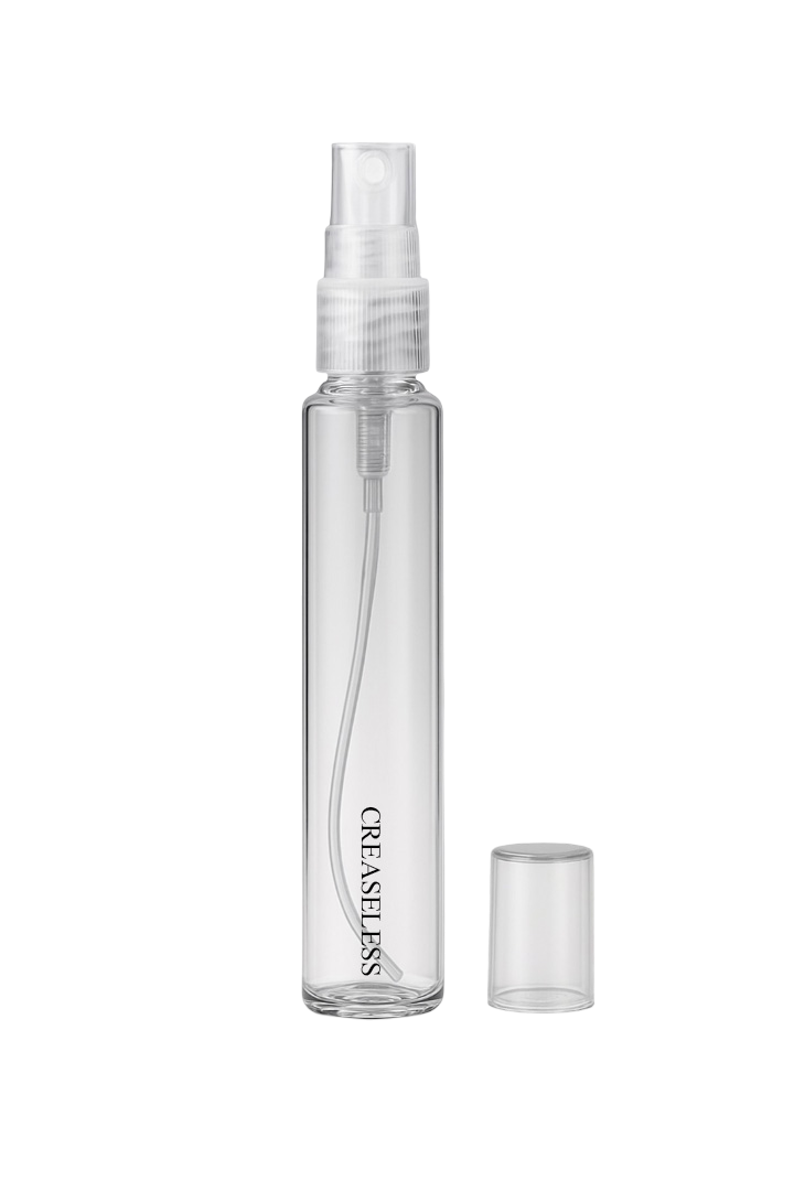 Our CREASELESS wrinkle-release spray is made in Switzerland and presented in a sleek, durable glass bottle that preserves the integrity of the formula while adding a refined, timeless look. The solution is carefully blended, combining aqua, alcohol, and hydroxypropyl cyclodextrin with a selection of functional ingredients to smooth fabrics and leave a fresh, subtle summer scent.